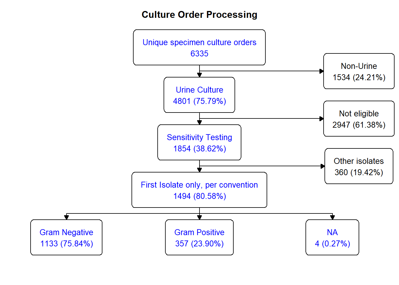 Focusing on the urine cultures, by convention, only the first isolate of a multi-isolate specimen result was counted and used for susceptibility / resistance testing; this subset totalled 1494, yielding 31.1% of all cultured urine specimen – a little under a third . Here’s the flowsheet for the rest of the process: