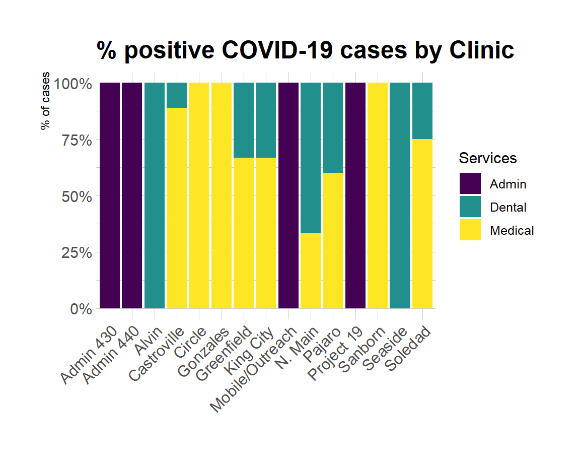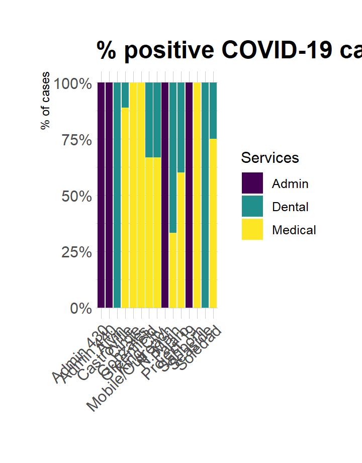We check for patterns among the different services: medical and dental clinical services, and administration. Total cases: 67