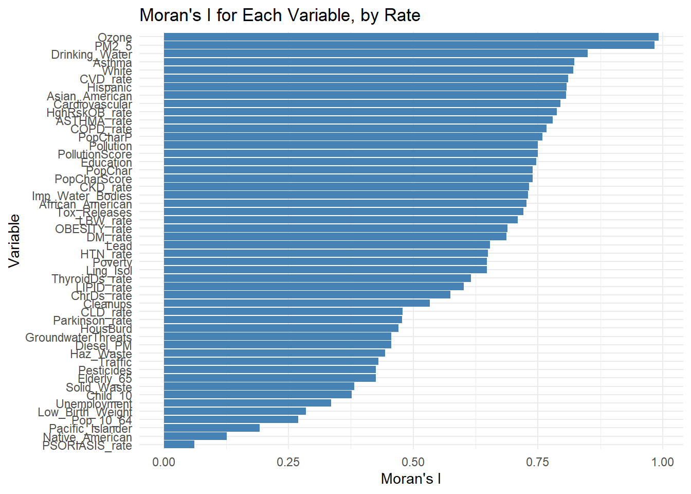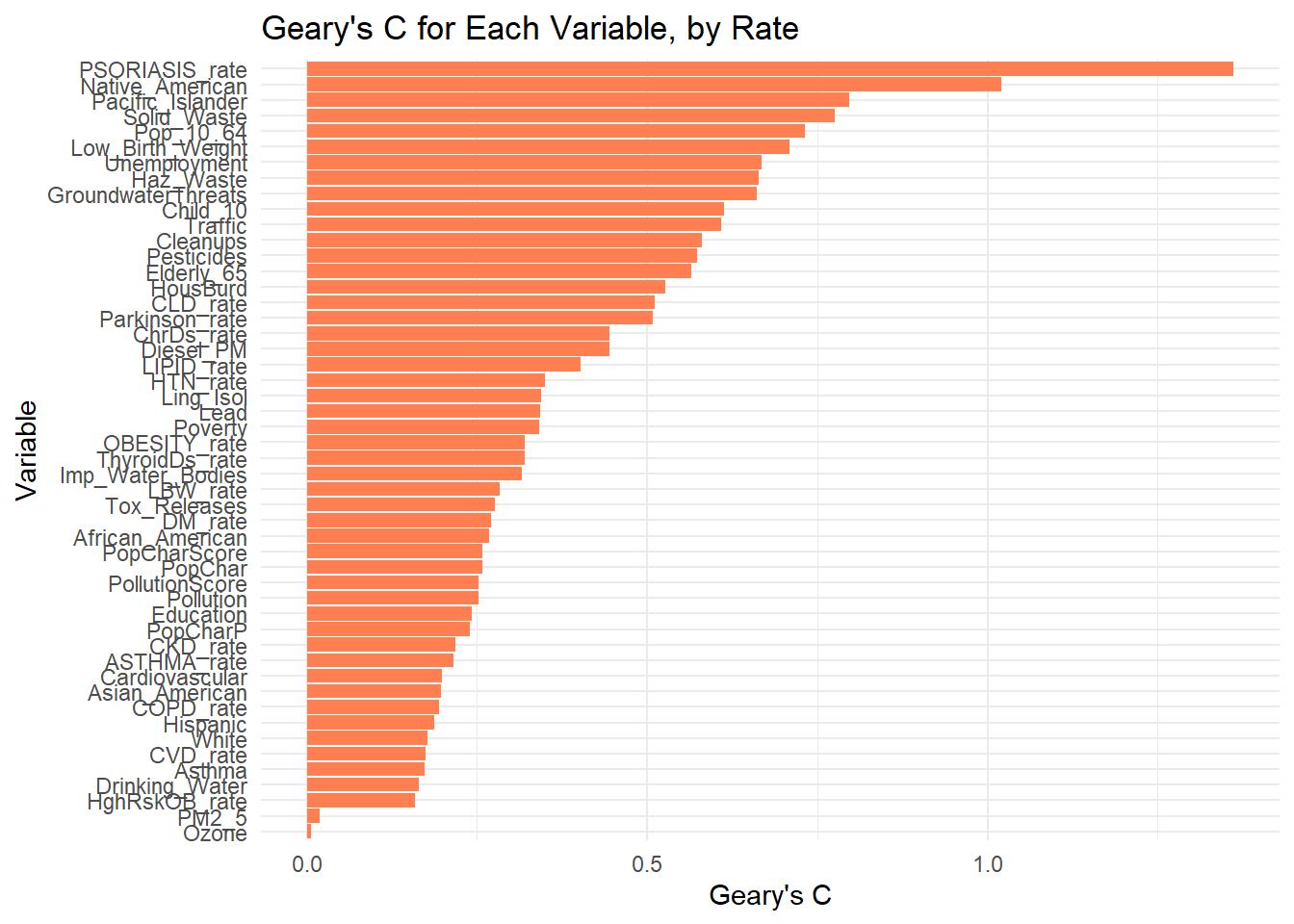 - Moran’s I and Geary’s C were calculated to assess the spatial autocorrelation of health outcomes and environmental factors.